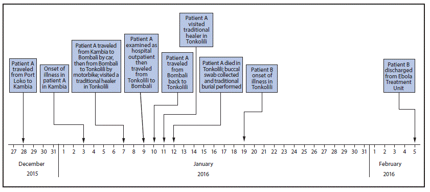 View suggested citationOn January 14, 2016, the Sierra Leone Ministry of Health and Sanitation was notified that a buccal swab collected on January 12 from a deceased female aged 22 years (patient A) in Tonkolili District had tested positive for Ebola virus by reverse transcription–polymerase chain reaction (RT-PCR). The most recent case of Ebola virus disease (Ebola) in Sierra Leone had been reported 4 months earlier on September 13, 2015 (1), and the World Health Organization had declared the end of Ebola virus transmission in Sierra Leone on November 7, 2015 (2). The Government of Sierra Leone launched a response to prevent further transmission of Ebola virus by identifying contacts of the decedent and monitoring them for Ebola signs and symptoms, ensuring timely treatment for anyone with Ebola, and conducting an epidemiologic investigation to identify the source of infection.