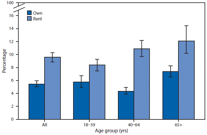 In 2015, the percentage of adults that visited an emergency department two or more times in the previous 12 months was higher among renters (9.5%) than among homeowners (5.4%). A higher percentage of homeowners aged ≥65 years (7.3%) visited the emergency department two or more times during the previous 12 months compared with homeowners aged 40–64 years (4.3%). Compared with renters aged 18–39 years (8.3%), the percentage of renters who visited the emergency department two or more times in the previous 12 months was higher among renters aged 40–64 years (10.8%) and ≥65 years (12.0%).