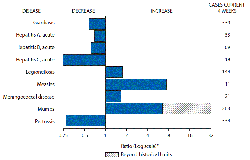 C.N.M.I.: Commonwealth of Northern Mariana Islands. U: Unavailable. —: No reported cases. N: Not reportable. NN: Not Nationally Notifiable. NP: Nationally notifiable but not published. Cum: Cumulative year-to-date counts. Med: Median. Max: Maximum. * Three low incidence conditions, rubella, rubella congenital, and tetanus, are in Table II to facilitate case count verification with reporting jurisdictions. † Case counts for reporting years 2016 and 2017 are provisional and subject to change. For further information on interpretation of these data, see http://wwwn.cdc.gov/nndss/document/ProvisionalNationaNotifiableDiseasesSurveillanceData20100927.pdf. Data for tuberculosis are displayed in Table IV, which appears quarterly. § Includes drug resistant and susceptible cases of Invasive Pneumococcal Disease. This condition was previously named Streptococcus pneumoniae invasive disease and cases were reported to CDC using different event codes to specify whether the cases were drug resistant or in a defined age group, such as <5 years. |
