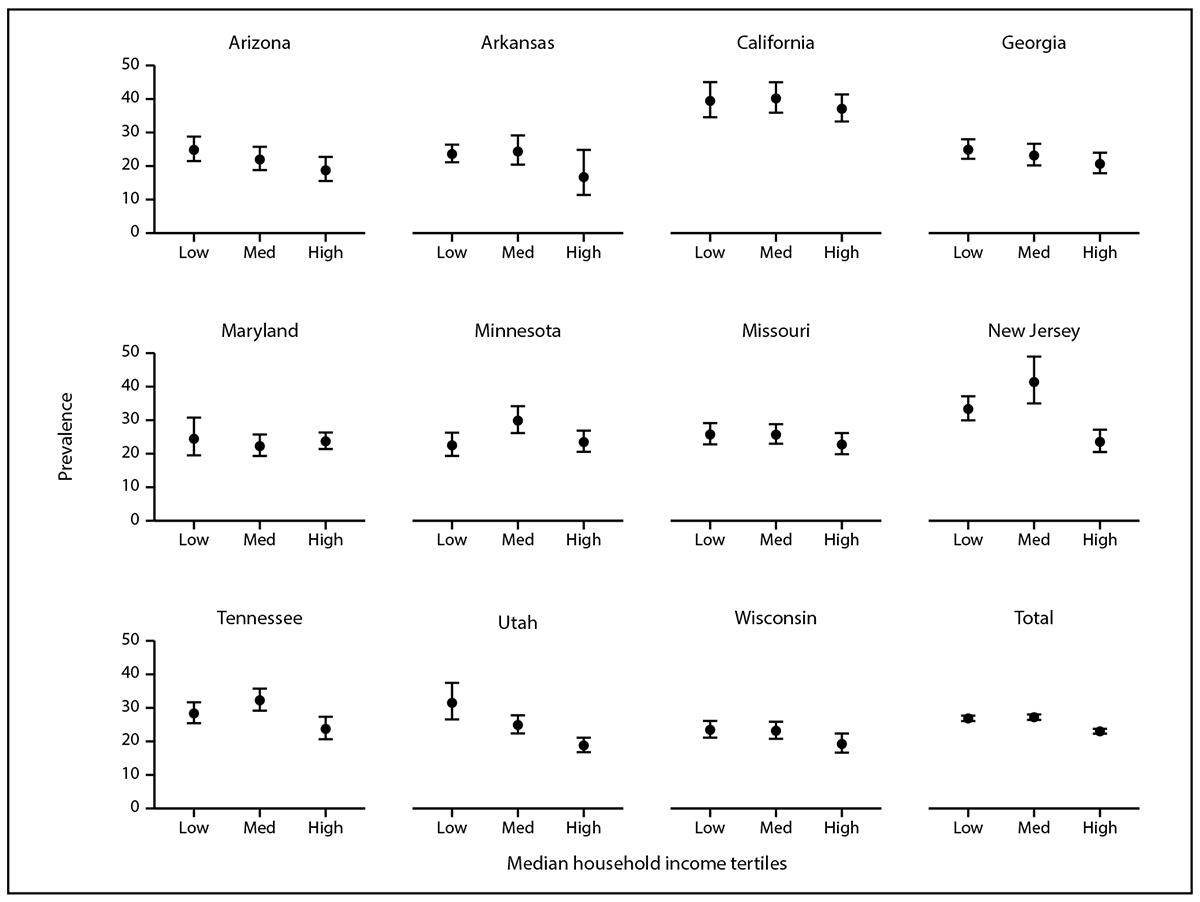 In eight sites, ASD prevalence was not associated with census tract-level MHI, but in three sites (Arizona, New Jersey, and Utah), lower ASD prevalence was observed among children living in census tracts with higher MHI (Figure 1). When all sites were combined, prevalence of ASD was lower among census tracts with higher MHI; however, ASD prevalences for the low, medium, and high SES tertiles were all between 23.0–27.2.