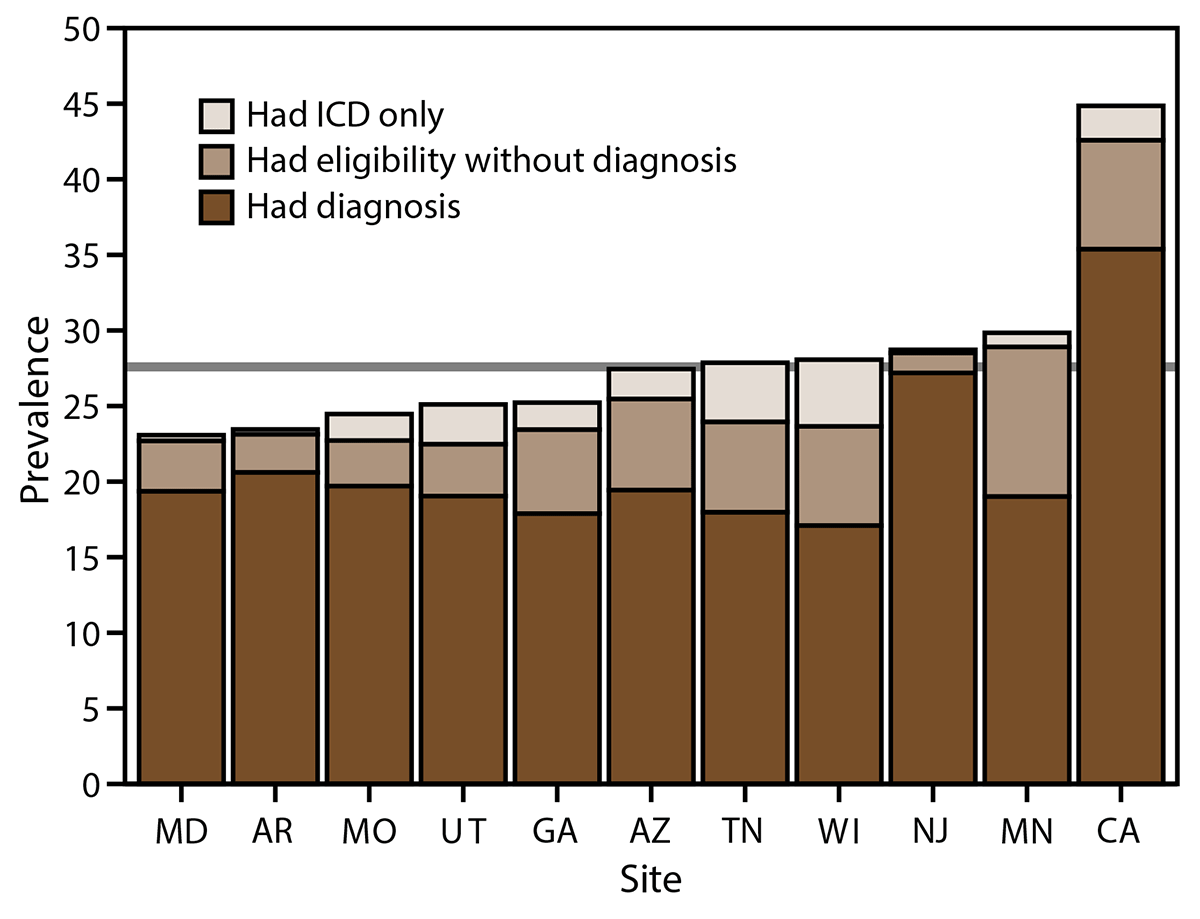 FIGURE 2. Prevalence* of autism spectrum disorder among children aged 8 years, by identification type and site — Autism and Developmental Disabilities Monitoring Network, 11 sites, United States, 2020†