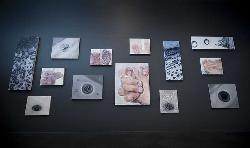 From this starting point, Peragine began a series of paintings for Watching Hands that evolved into an installation of canvases, sculptures, and animations. The actual sizes of the paintings and the things they depict descend in scale-sudsy hands, water draining in sinks, splashes of water, and soapy bubbles that verge on being microbial—and are installed salon-style. Sculpted sinks and drains made of soap sit on pedestals, drawing upon his frequent strategy to make objects in familiar, yet subversive materials. A skilled animator, Peragine also has created an animation of soap bubbles as the final component of his installation. The collective work is surprisingly comforting, as he captures the soulfulness of our daily handwashing routines, as well as a sense of a shared human experience.