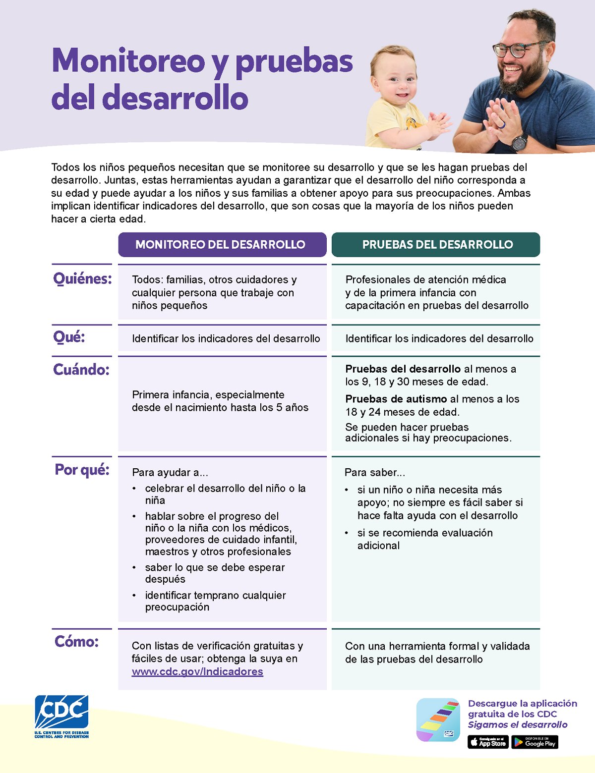 Este recurso Del nacimiento a los cinco: ¡Mírame crecer! puede ser utilizado para el seguimiento de los antecedentes de evaluaciones del desarrollo del niño y para compartir los resultados con los proveedores.
