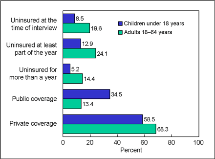 Based on data from the January-September 2008 NHIS, a total of 55.2 million (18.5%) persons of all ages were uninsured for at least part of the year prior to the interview (Tables 1 and 2). Adults aged 18-64 years were almost twice as likely to experience this lack of coverage (24.1%) as children under the age of 18 (12.9%).