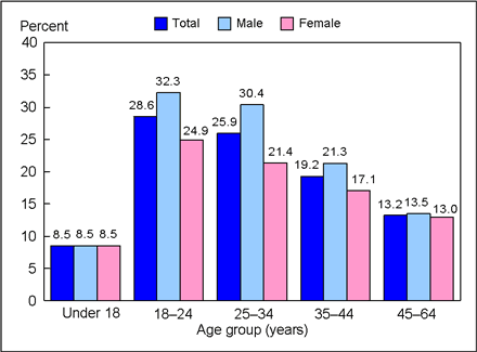 For all persons under 65 years of age, the percentage of persons who were uninsured at the time of the interview was highest among those aged 18-24 years (28.6%) and lowest among those under 18 years (8.5%) (Figure 2). Starting at age 18, younger adults were more likely than older adults to lack health insurance coverage. Among adults in age groups 18-24, 25-34, and 35-44 years, men were more likely than women to lack health insurance coverage at the time of interview.