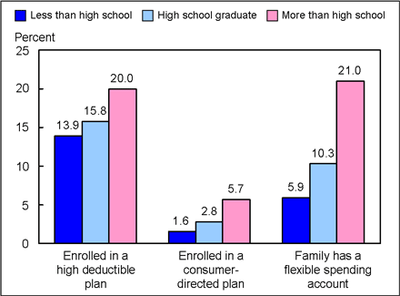 Based on data from the January-September 2008 NHIS, 18.9% of persons under 65 years of age with private health insurance were enrolled in a HDHP, 5.0% were enrolled in a CDHP, and 18.0% were in a family with a FSA for medical expenses (Figure 3). Adults aged 25-64 years with more than a high school diploma were more likely to be covered by a HDHP, more likely to be covered by a CDHP, and more likely to be in a family with a FSA for medical expenses than those who had only a high school diploma or were not high school graduates (Figure 4).