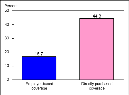 Approximately 17% of persons under 65 years of age with employer-based private coverage were enrolled in a HDHP, compared with over 44% enrolled in a HDHP among those with a private plan that was directly purchased or obtained through means other than an employer (Figure 5).