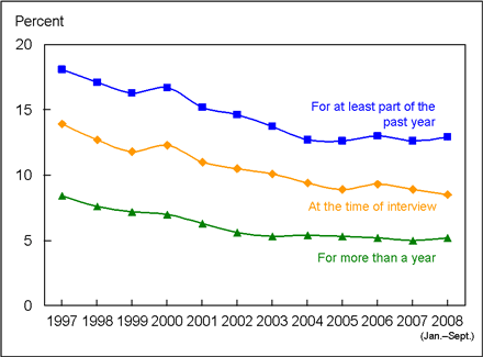 Among adults aged 18-64 years, the percentage uninsured for more than a year fluctuated between 11.9% and 14.5% between 1997 and the first 9 months of 2008 (Figure 7 ). By contrast, the percentage of children uninsured for more than a year decreased from 8.4% in 1997 to 5.3% in 2003 (Figure 6). Since 2003, the percentage of children uninsured for more than a year has remained relatively steady and has ranged between 5.0% and 5.4%.