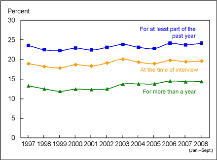 The percentage of children uninsured during at least part of the year prior to the interview decreased from 18.1% in 1997 to 12.9% in the first 9 months of 2008 (Figure 6). However, since 2003, the percentage of children uninsured during at least part of the year prior to interview has remained relatively stable and has ranged from 12.6% to 13.7%. Between 1997 and the first 9 months of 2008, the percentage of adults aged 18-64 years who lacked coverage for at least part of the year prior to the interview fluctuated between 22.2% and 24.1% (Figure 7 and Table 1).