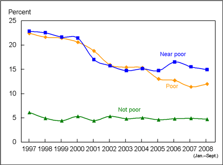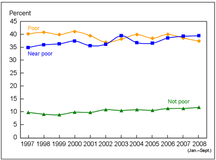 1Poverty status is based on family income and family size, using the U.S. Census Bureau’s poverty thresholds. “Poor” persons are defined as those below the poverty threshold, “near poor” persons have incomes of 100% to less than 200% of the poverty threshold, and “not poor” persons have incomes of 200% of the poverty threshold or greater. The percentage of respondents with unknown poverty status was 19.1% in 1997, 23.6% in 1998, 26.4% in 1999, 27.0% in 2000, 27.1% in 2001, 28.1% in 2002, 31.5% in 2003, 29.6% in 2004, 28.9% in 2005, 30.7% in 2006, 18.0% in 2007, and 16.2% in the first three quarters of 2008. For more information on the unknown income and poverty status categories, see the National Health Interview Survey (NHIS) Survey Description Document for years 1997-2005, available from the NHIS website. Estimates may differ from estimates based on both reported and imputed income. See “Technical Notes ” for a discussion of the use of imputed income in the stratification of health insurance coverage by poverty.