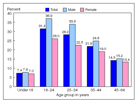 | 18-64 years | 21.5 (0.65) | 26.2 (0.70) | 16.0 (0.58) |