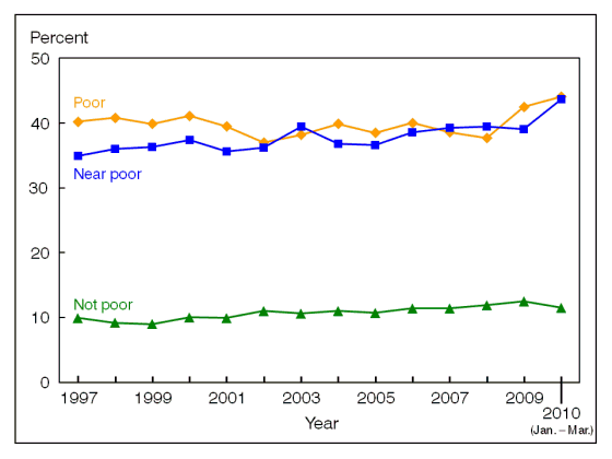 1Poverty status is based on family income and family size, using the U.S. Census Bureau’s poverty thresholds. “Poor” persons are defined as those below the poverty threshold; “near poor” persons have incomes of 100% to less than 200% of the poverty threshold; and “not poor” persons have incomes of 200% of the poverty threshold or greater. The percentage of respondents with unknown poverty status was 19.1% in 1997, 23.6% in 1998, 26.4% in 1999, 27.0% in 2000, 27.1% in 2001, 28.1% in 2002, 31.5% in 2003, 29.6% in 2004, 28.9% in 2005, 30.7% in 2006, 18.0% in 2007, 15.8% in 2008, and 12.3% in 2009 and 11.1% in the first quarter of 2010. For more information on the unknown income and poverty status categories, see the National Health Interview Survey (NHIS) Survey Description Document for years 1997-2005, available from the NHIS website. Estimates may differ from estimates based on both reported and imputed income. See “Technical Notes ” for a discussion of the use of imputed income in the stratification of health insurance coverage by poverty status.