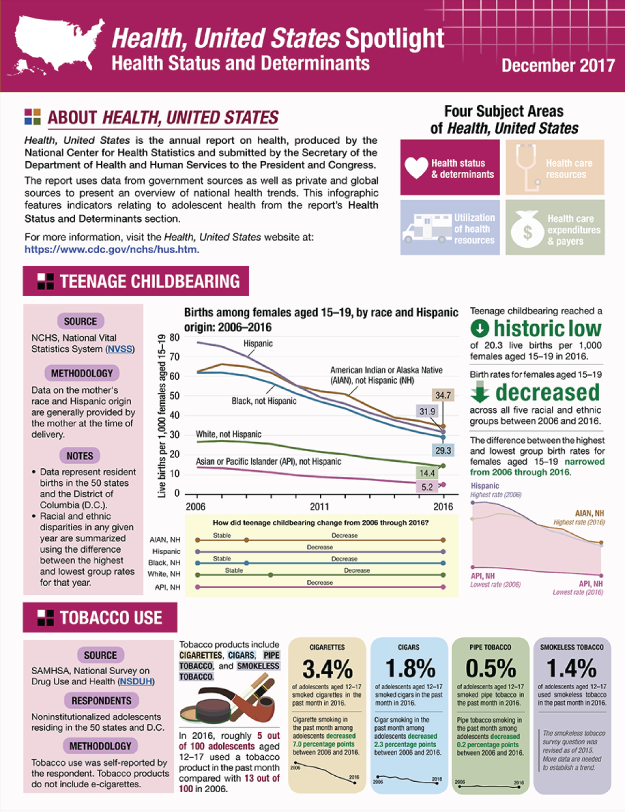 The Health, United States Spotlight is an infographic series that explores topics of public health importance using data from the Health, United States annual report. Spotlights are published throughout the year and feature the most current data available at the time of publication. Consistent with the annual report, the Spotlight focuses on trends over time and features data from both NCHS and non-NCHS (government or private) sources. Health, United States data cover four subject areas: health status and determinants, utilization of health resources, health care resources, and health care expenditures and payers.