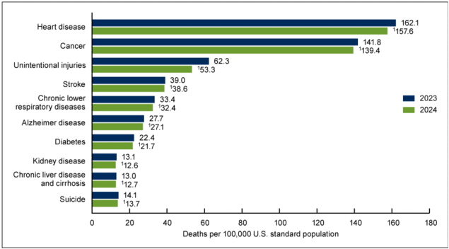 NOTES: A total of 3,072,666 resident deaths were registered in the United States in 2024. The 10 leading causes of death accounted for 70.9% of all U.S. deaths in 2024. Causes of death are ranked according to number of deaths in 2024. Rankings for 2023 data are not shown.