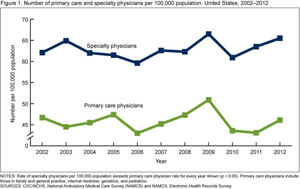 Figure 1. Number of primary care and specialty physicians per 100,000 population: United States, 2002–2012