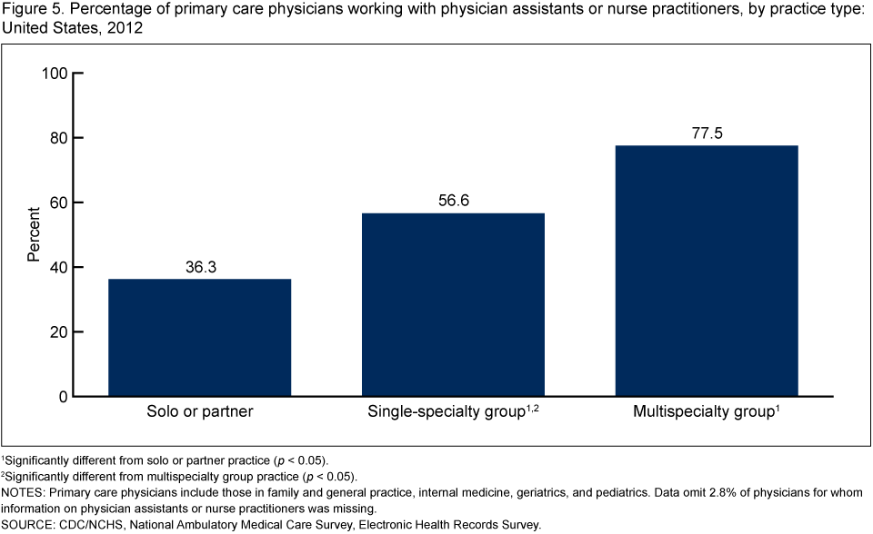 - The percentage of primary care physicians with physician assistants or nurse practitioners in their practices in 2012 (53.0%) was similar to that in 2006 (51.2%), the first year in which NAMCS collected this information (data not shown).