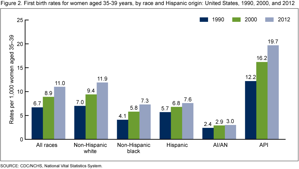 - First birth rates for women aged 35–39 rose among all race and Hispanic origin groups from 1990 to 2012.