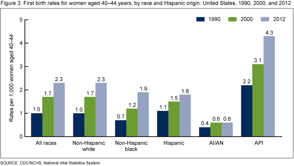 - Of all race and Hispanic origin groups, API women at age 40–44 had the highest first birth rates from 1990 to 2012.