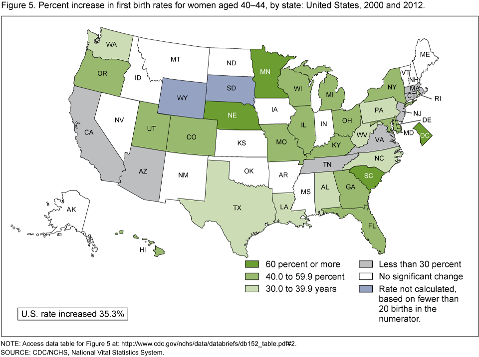 - Thirty-three states and DC had an increase in the first birth rates for women aged 40–44 from 2000 to 2012.