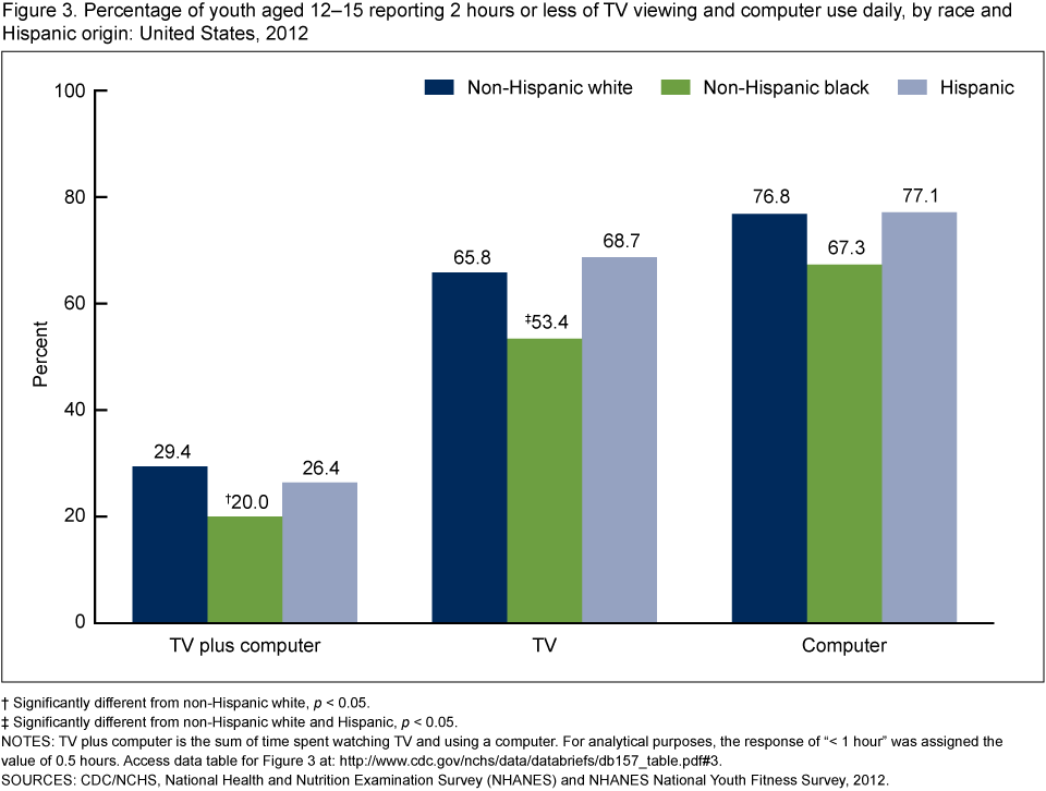 Figure 3. Percentage of youth aged 12–15 reporting 2 hours or less of TV viewing and computer use daily, by race and Hispanic origin: United States, 2012