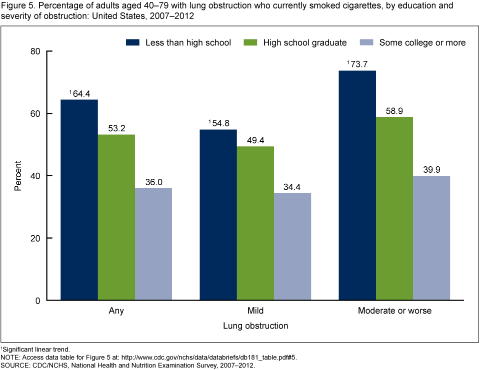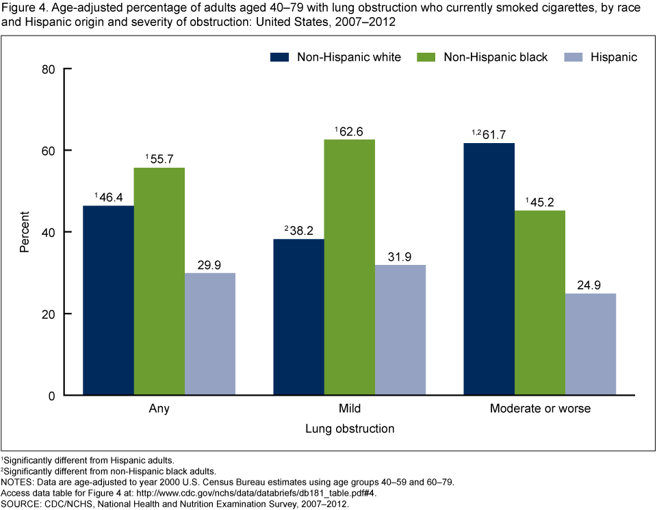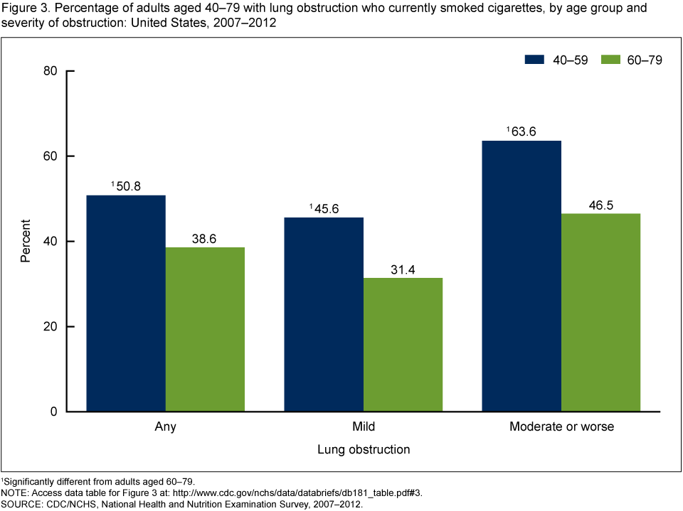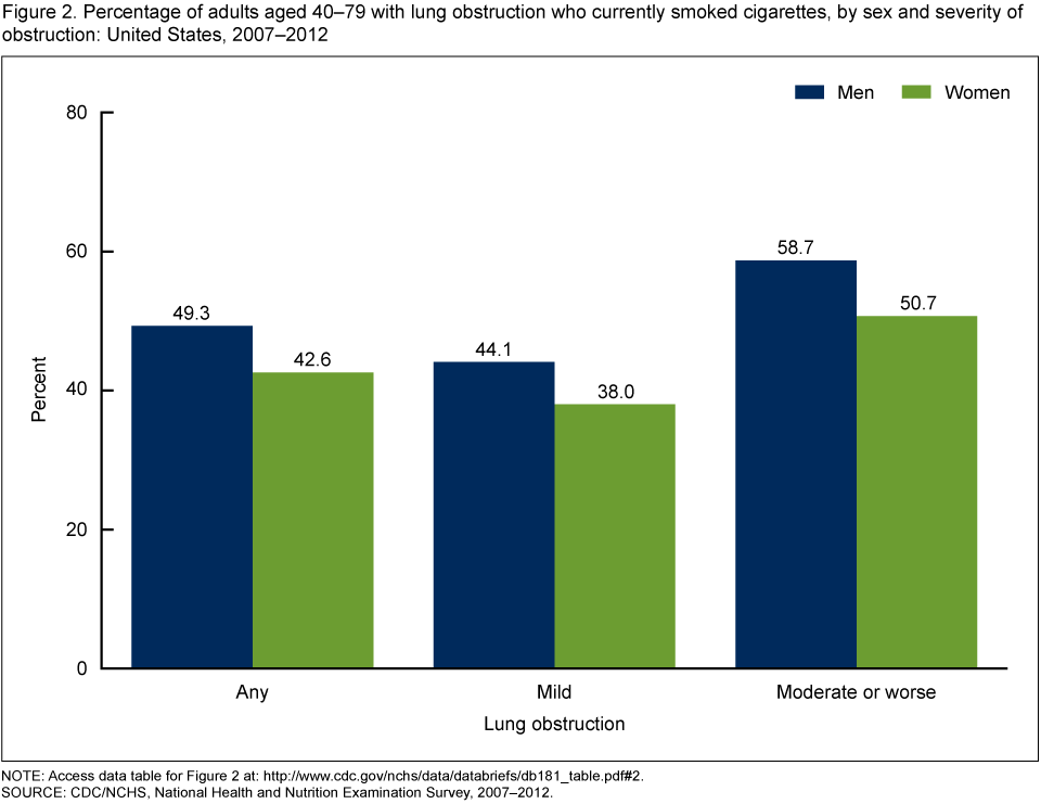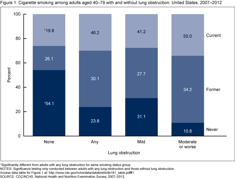Paulose-Ram R, Tilert T, Dillon CF, Brody DJ. Cigarette smoking and lung obstruction among adults aged 40–79: United States, 2007–2012. NCHS data brief, no 181. Hyattsville, MD: National Center for Health Statistics. 2015.