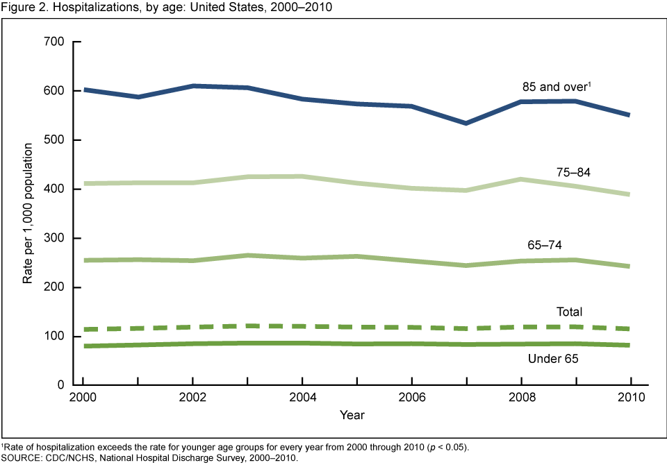 - From 2000 through 2010, the hospitalization rate for adults aged 85 and over remained significantly higher than the rates for adults under age 65, aged 65–74, and aged 75–84.