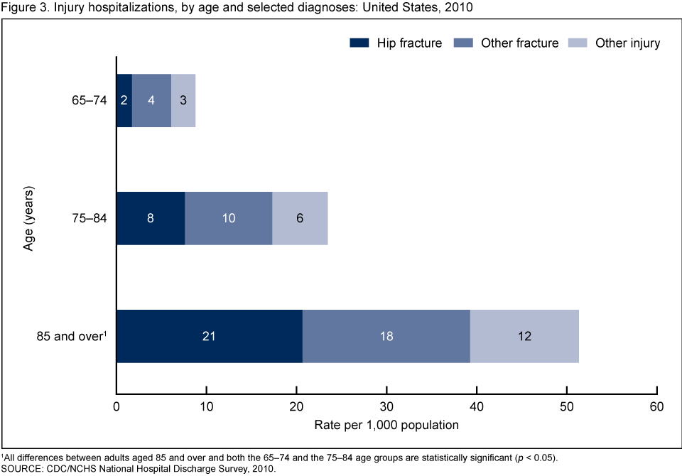 - The rate of fractures and other injuries was higher for adults aged 85 and over (51 per 1,000 population) than for adults aged 65–74 (9 per 1,000 population) and 75–84 (23 per 1,000 population).