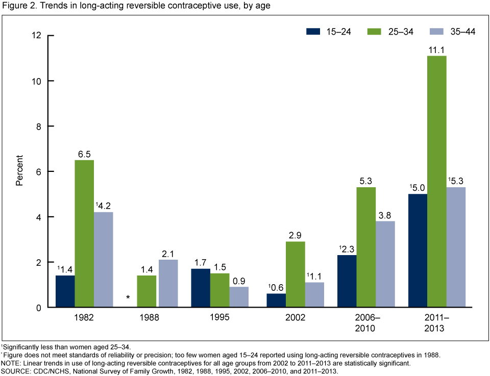 - In 1982 and since 2002, women aged 25–34 used long-acting reversible contraception at a higher rate compared with women aged 15–24 or 33–44.