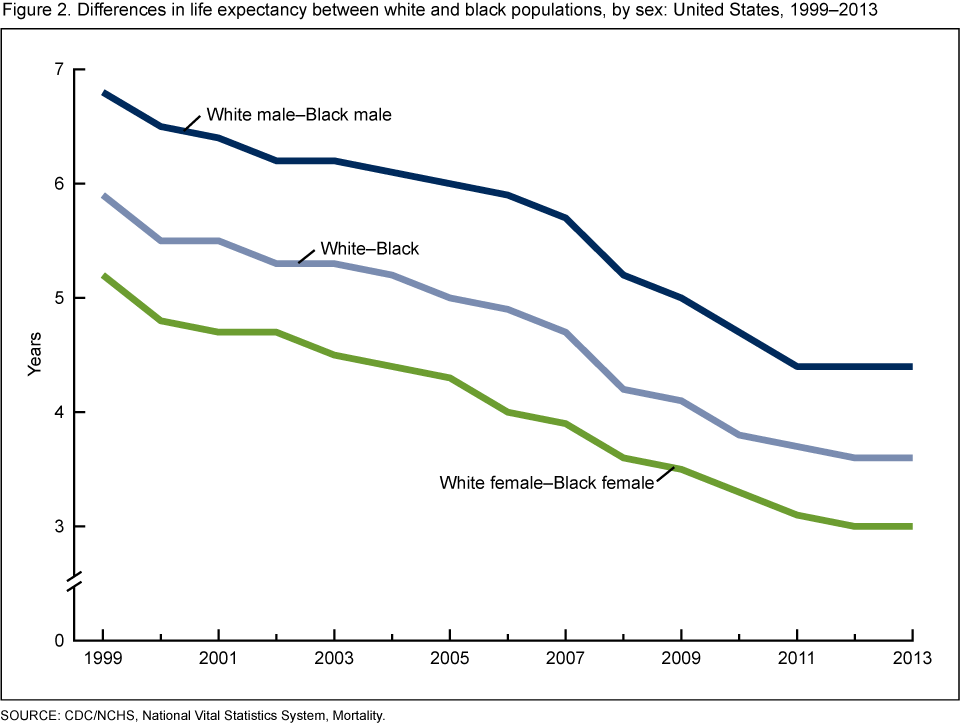 Between 1999 and 2013, the gap in life expectancy between the black and white populations decreased by 2.3 years. For black and white males, the decrease in the gap was 2.4 years, and for black and white females, the decrease in the gap was 2.3 years.