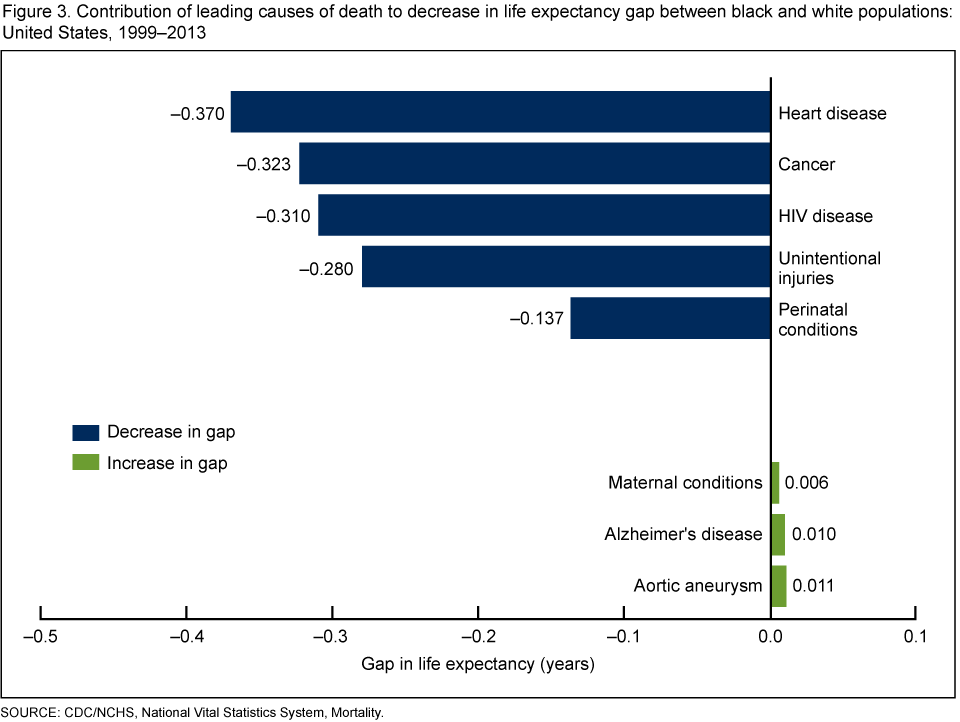 - The decrease in the gap in life expectancy between the black and white populations was due to larger decreases in death rates for the black population for heart disease, cancer, HIV disease, unintentional injuries, and perinatal conditions (Figure 3), which together accounted for 59.1% of the 2.3-year decrease in the gap.