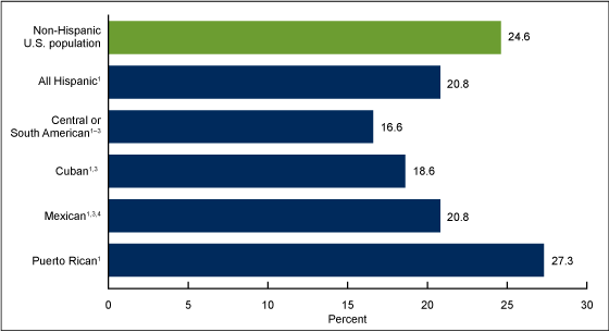Lucas JW, Freeman G, Adams PF. Health of Hispanic adults: United States, 2010–2014. NCHS data brief, no 251. Hyattsville, MD: National Center for Health Statistics. 2016.