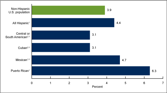- After age adjustment, Puerto Rican adults (6.3%) were more likely than Central or South American (3.1%), Cuban (3.1%), Mexican (4.7%), and