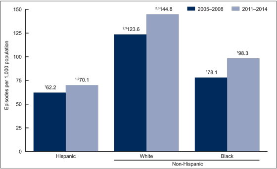 - In 2011–2014, the rate continued to be highest among non-Hispanic white females (144.8 episodes per 1,000 population), however, the rate among non-Hispanic black females was significantly higher than the rate among Hispanic females.