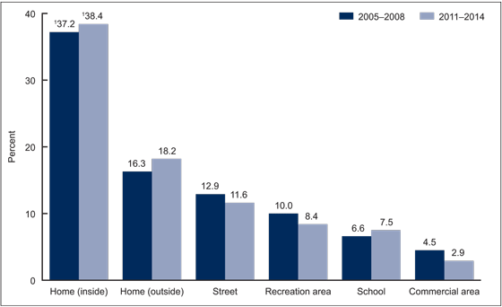 - Inside the home was the leading place of nonfatal injury occurrence in both 2005–2008 (37.2% of injury episodes) and 2011–2014 (38.4%), followed by outside the home, street, recreation area, school, and commercial area (Figure 5).