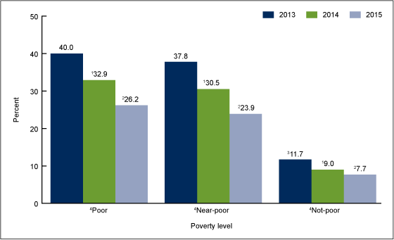 - From 2013 through 2015, the percentage of adults aged 18–64 who were uninsured at the time of interview decreased for poor (from 40.0% to 26.2%), near-poor (from 37.8% to 23.9%), and not-poor (from 11.7% to 7.7%) adults (Figure 1).