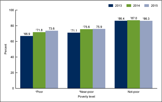 - The percentage of poor and near-poor adults who had seen or talked to a health professional in the past 12 months increased from 2013 through 2015.
