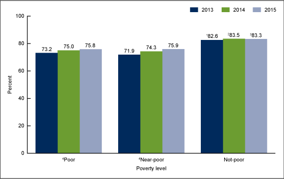 Figure 3. Adults aged 18–64 who had seen or talked to a health care professional in the past 12 months, by family poverty level: United States, 2013–2015