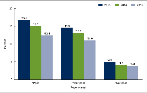 Martinez ME, Ward BW. Health care access and utilization among adults aged 18–64, by poverty level: United States, 2013–2015. NCHS data brief, no 262. Hyattsville, MD: National Center for Health Statistics. 2016.