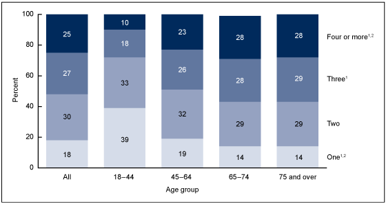 - Eighteen percent of visits by adults aged 18–44 with hypertension were made by adults with three chronic conditions. This number increased to 26% for adults aged 45–64, 28% for those aged 65–74, and 29% for those aged 75 and over.