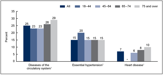 - The primary diagnosis for 23% of visits made by adults aged 18–44 with hypertension was a disease of the circulatory system. This percentage increased as age increased, reaching 29% for those aged 75 and over (Figure 5).