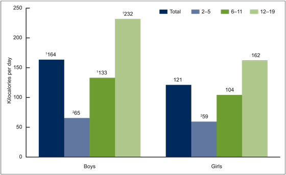 - Boys aged 2–5 consumed 65 kcal, boys aged 6–11 consumed 133 kcal, and boys aged 12–19 consumed 232 kcal from sugar-sweetened beverages.