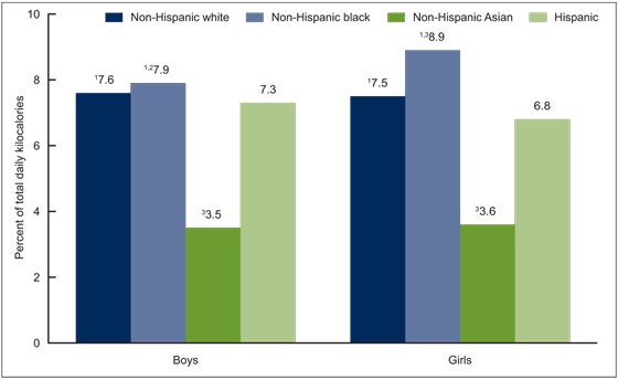 - The percentage of total daily calories from sugar-sweetened beverages was similar for non-Hispanic black (7.9%), non-Hispanic white (7.6%), and Hispanic (7.3%) boys, all of which were higher than for non-Hispanic Asian boys (3.5%) (Figure 5).