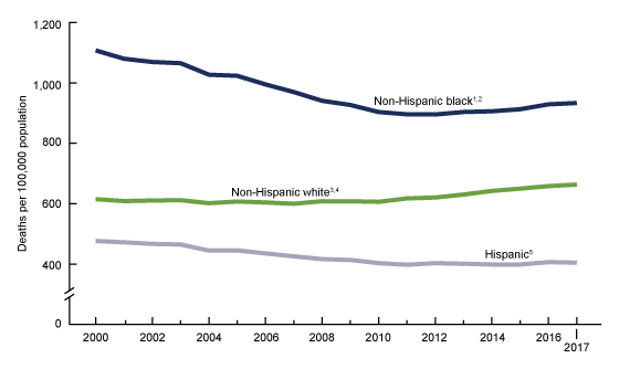 - Age-adjusted death rates for non-Hispanic white and non-Hispanic black adults aged 25 and over declined from 2000 to 2011–2012 (from 1,288.1 in 2000 to 1,135.9 in 2011 and from 1,690.3 in 2000 to 1,319.6 in 2012, respectively), but remained stable through 2017.