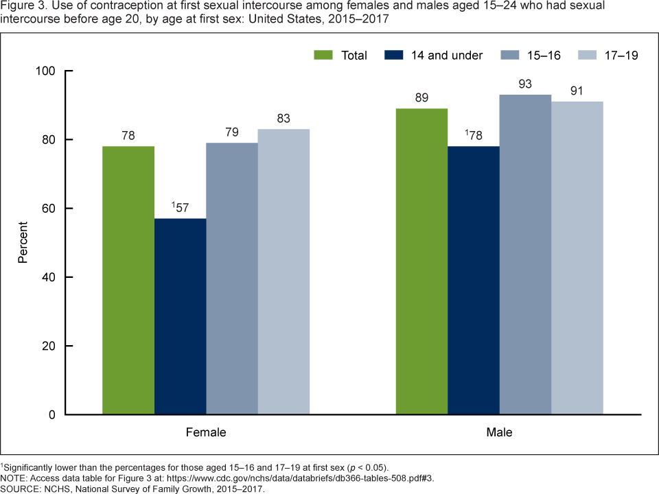 - In 2015–2017, 78% of females and 89% of males aged 15–24 who had their first sexual intercourse before age 20 used a contraceptive method at first sexual intercourse.