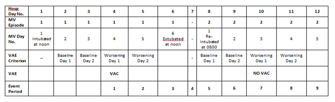 In the example presented in the table below, you will see that there is a VAC detected on hospital day 4 during the first episode of mechanical ventilation. The patient is extubated on hospital day 6 and remains off MV for one full calendar day (hospital day 7). On hospital day 8, the patient is re-intubated, thereby starting a second episode of MV. The patient is observed to meet VAC criteria, with a baseline period of stability or improvement on hospitals days 8 and 9 and a period of worsening on hospitals days 10 and 11 – but because the patient is still within the 14-day event period for the VAE detected on hospital day 4, a new VAE is not reported.