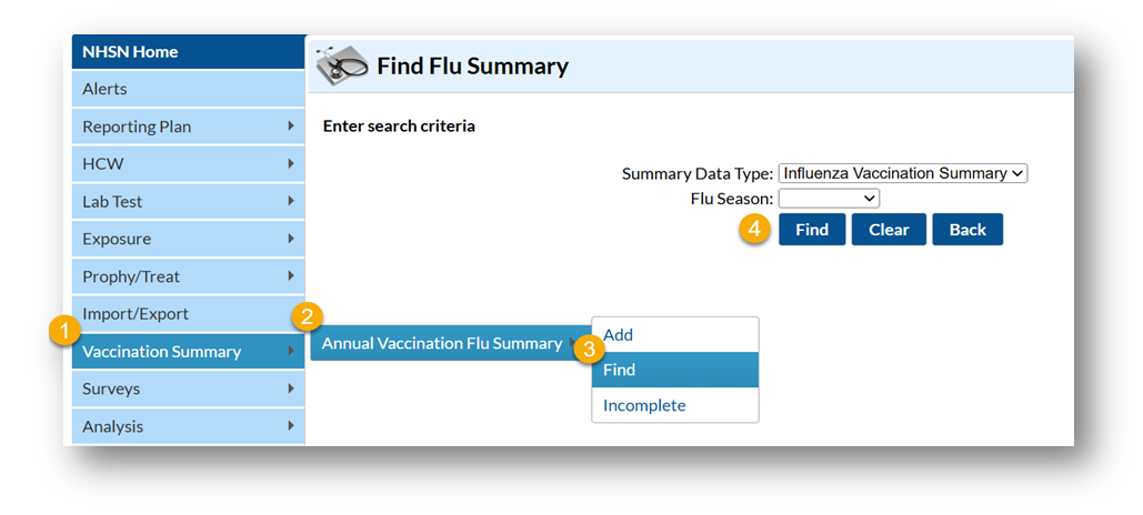 One way to confirm data entry is to login to the Healthcare Personnel Safety Component and then choose your facility. Next, go to Vaccination Summary on the left-hand navigation bar, click on Annual Vaccination Flu Summary, then Find. For Summary Data Type, choose the Influenza Vaccination Summary, and in the Flu Season drop-down box, choose the influenza season you would like to verify (e.g., 2025– 2026). Facilities should also confirm that the correct CCN is entered into NHSN. Facilities can also run a report that will show when data were first entered and last modified in the NHSN application. For instructions on running this report, please see: Create dates for influenza QRG (cdc.gov) [PDF – 610 KB].