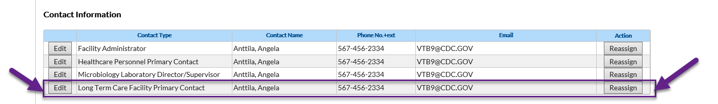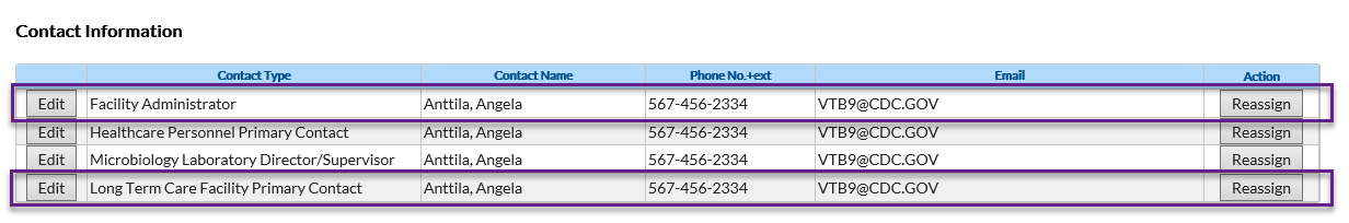 - The NHSN facility administrator can easily edit and update or reassign the NHSN facility primary contact to another registered user in the facility.