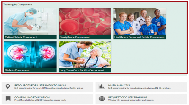 - Emphasis placed on each NHSN Component. Clicking on each icon will take the user to a comprehensive list of training for the respective component. The sixth space will be used for the incoming Outpatient Procedure Component.