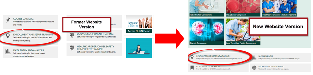 - The “Enrollment and Set-up Training” icon has changed to “Resources for Users New to NHSN”. The resources for users new to NHSN includes enrollment and set-up training, as well as the links to the interactive, self-paced training activities recommended for new NHSN users.