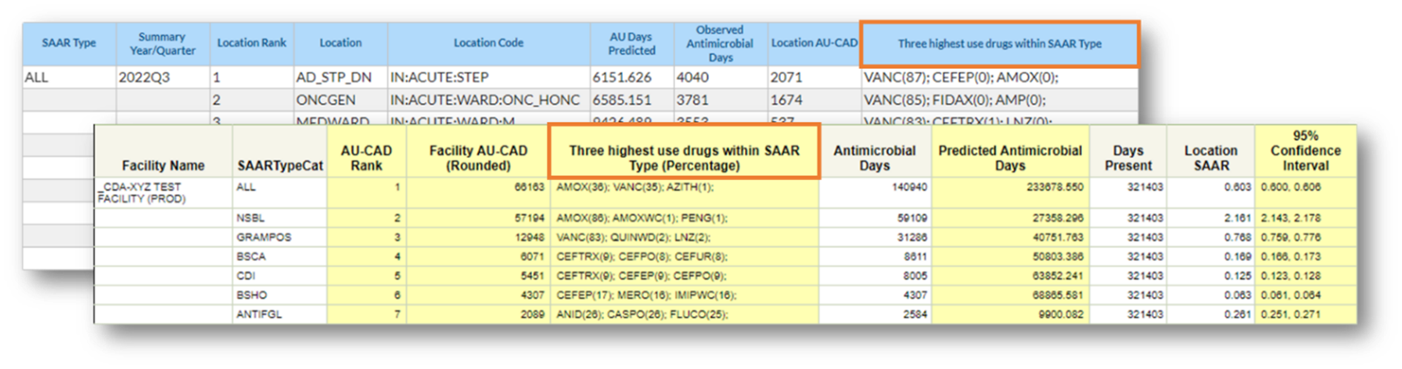 The “Three highest use drugs within SAAR Type” column in the TAS reports and dashboards displays the top three antimicrobials that contributed to each SAAR antimicrobial category for the selected time period and, in parenthesis, the percent of observed antimicrobial days each antimicrobial contributed. If two or more antimicrobials contributed the same number of observed antimicrobial days, they are listed in alphabetical order by drug code. You can find the full drug names in the AU tab of the Antimicrobial Use and Resistance (AUR) Module Eligible Antimicrobial Agents spreadsheet (http://www.cdc.gov/nhsn/xls/aur/aur-eligible-antimicrobial-agents.xlsx [XLS – 479 KB]).